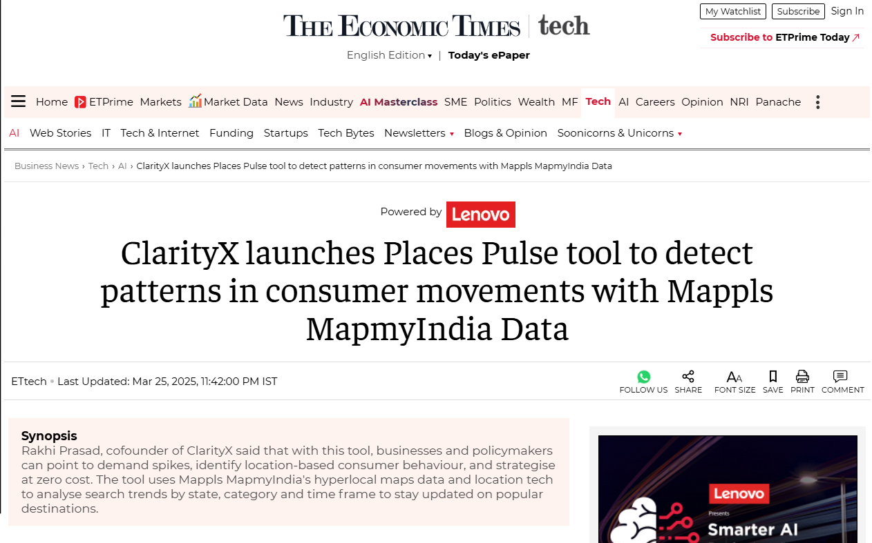 ClarityX, an AI-driven data analytics and consulting firm founded by MapmyIndia founders, unveiled Places Pulse on Tuesday, a search analytics tool designed to decipher consumers’ movement trends. Powered by Mappls MapmyIndia’s hyperlocal map data, it offers real-time, actionable insights into consumer behaviour, it said in a press release. The tool analyses anonymised search data from millions of users, providing an understanding of market demand and location intelligence.