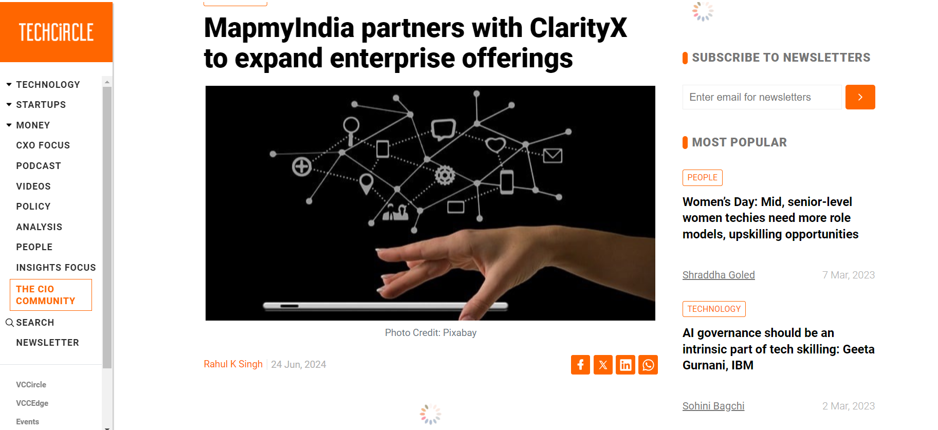 MapmyIndia, a deep-tech digital mapping and geospatial software company, has announced an expansion of its enterprise offerings by partnering with ClarityX, an AI-driven data analytics and consulting firm. This move is set to broaden MapmyIndia’s market reach and enhance its service capabilities. To be sure, ClarityX, launched in 2023, is backed by MapmyIndia founders but operates as a separate entity.