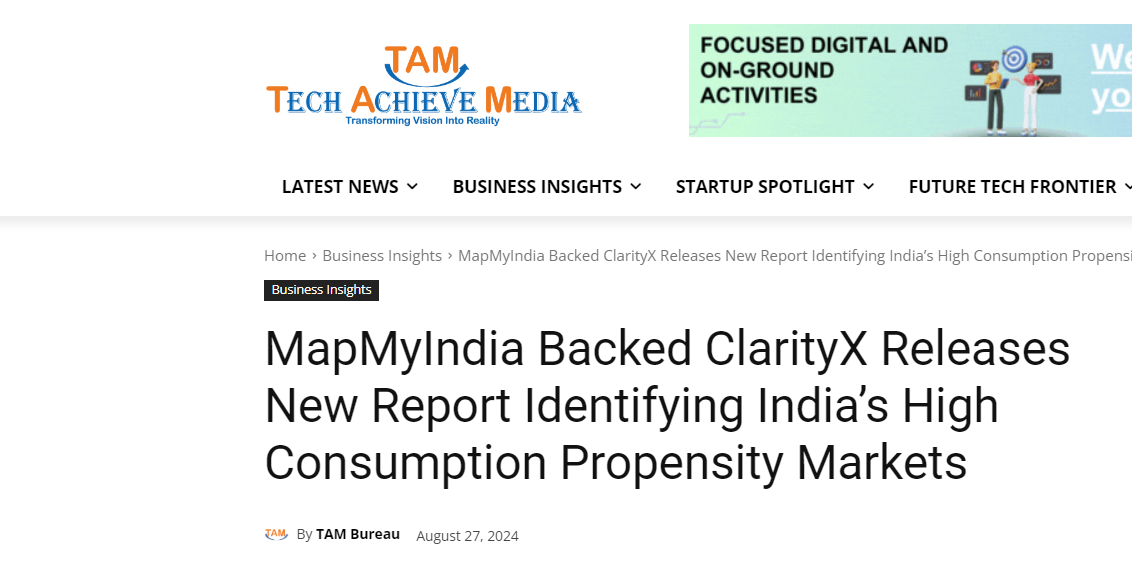 AI Driven Data Analytics and Consulting company ClarityX, backed by MapmyIndia’s founders, released its inaugural ‘ClarityX District Potential Index 2024 Report’. This Report, the company says, is a comprehensive guide that identifies India’s high consumption propensity markets at both a macro and micro level. It serves as an essential tool for brands, corporates, and governments to pinpoint high-potential markets for the future.